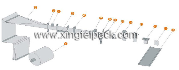 | 1. Desbobinado de película | 4. Detección de escala de color | 7.Sellado vertical Ⅱ | 10. Sujeción de la bolsa Ⅰ | 13. Abertura doble de la bolsa | 16. Sellado principal |